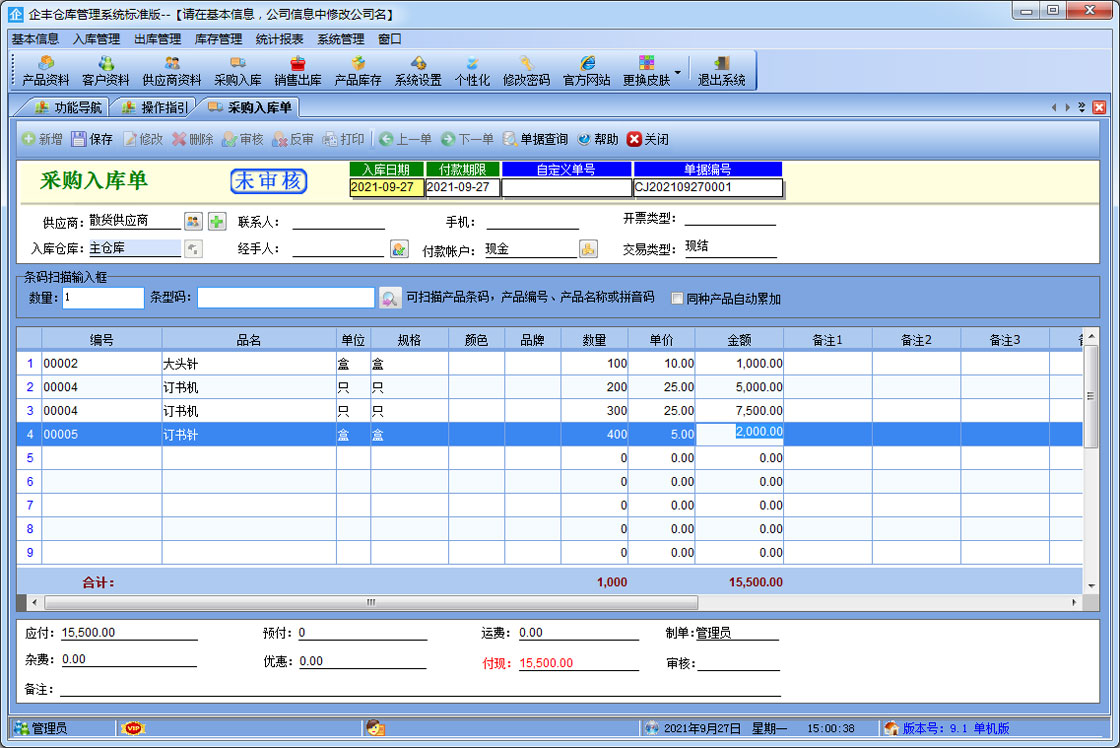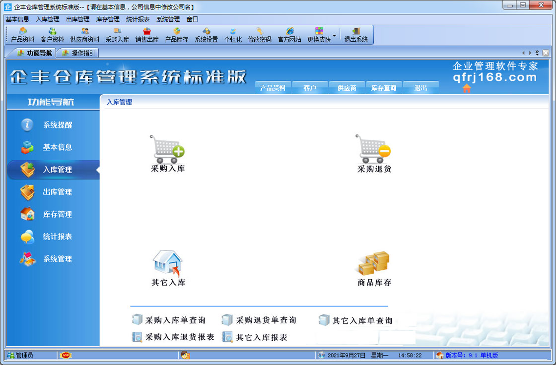 入库管理:进行货品采购入库,采购退货,生产入库,生产退料,进货单据和退货单据查询。
