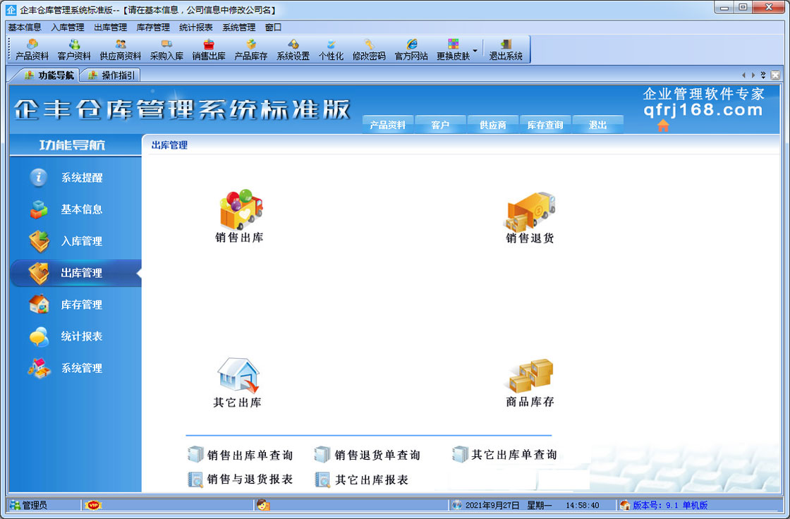 出库管理:销售出货,客户退货,生产领料,销售单据和客户退货查询。